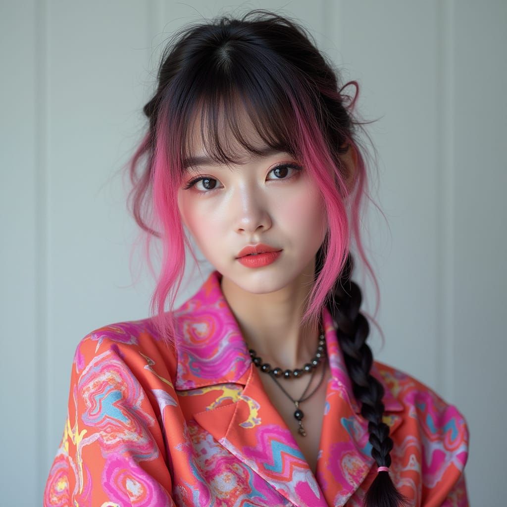A vibrant image of a woman sporting a pink and black braid. She is wearing a Kpop-inspired outfit with bold colors and dynamic patterns, in an anime art style.