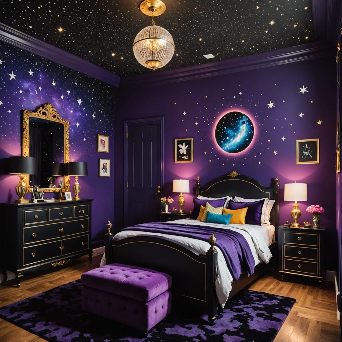 This image shows a maximalist art deco kid's bedroom bathed in purple and black hues. The room features glow-in-the-dark star-covered walls, brightly colored furniture, and ornate decorations.