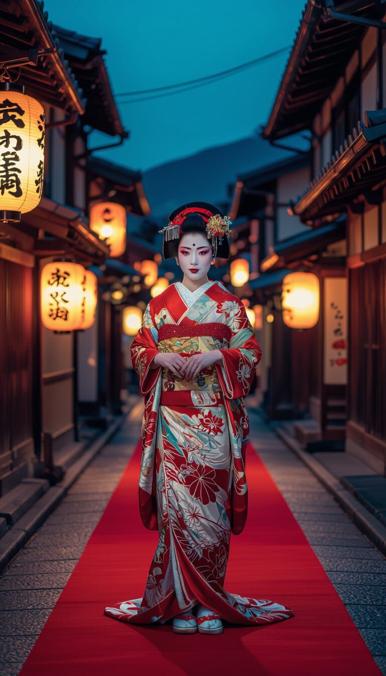 A hyperrealistic image of a Japanese courtesan in a detailed kimono and geisha makeup on a red carpet. The scene is set on an ancient street at night, illuminated by paper lanterns, with a cinematic atmosphere.