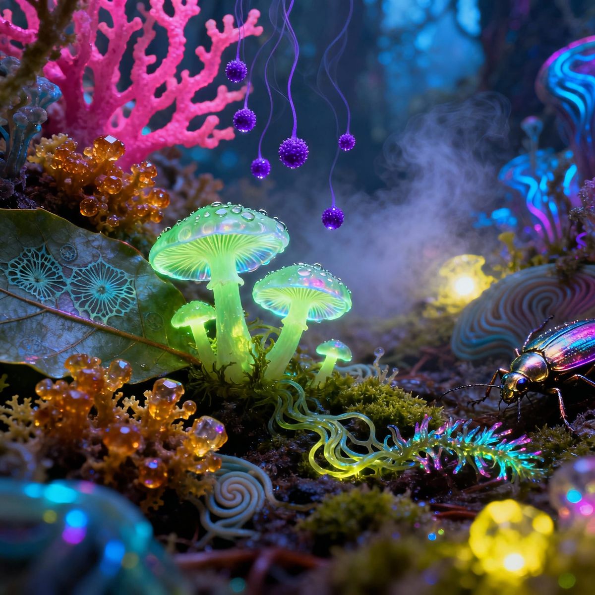 This image captures a vibrant, alien forest floor from a microscopic perspective. Intricate, glowing flora and fauna create a magical atmosphere with vivid colors and dramatic lighting.