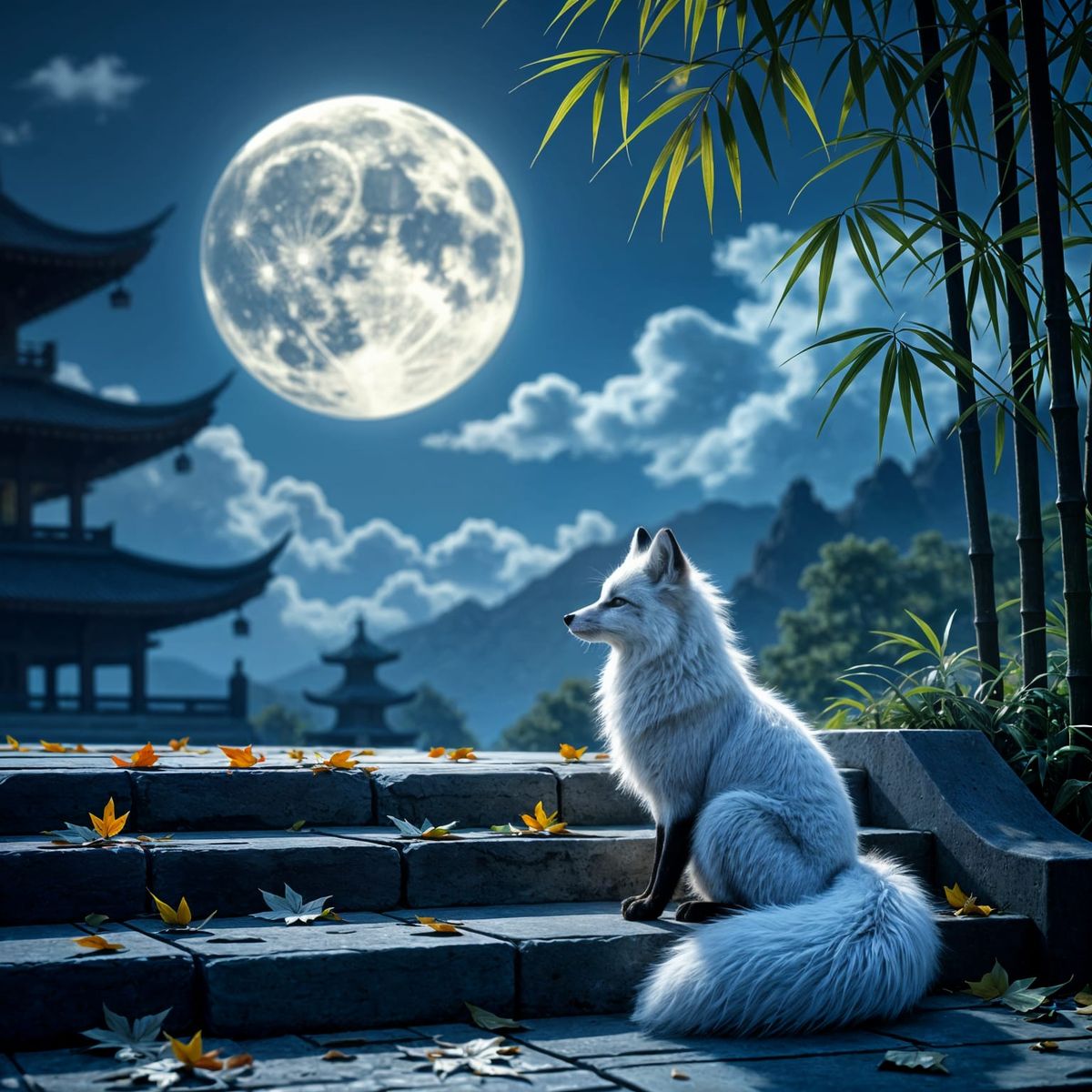 This image depicts a white fox made of black ink sitting on the steps of a Buddhist temple under a full moon. The surrounding landscape is rendered with hyper-realistic detail, in a mystical airbrush art style.