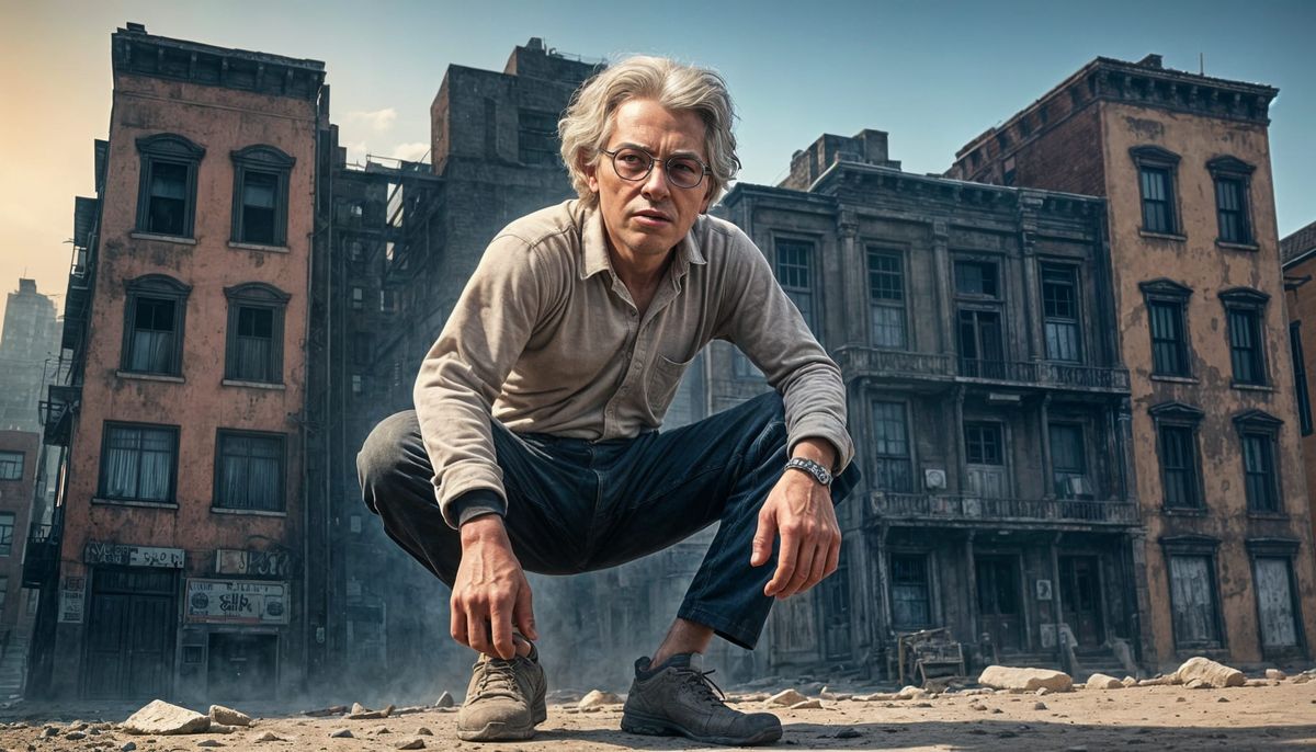 This image shows a dystopian scene with a focus on kinetic pointillism and charcoal drawing techniques. A body is partially visible, set against a background that suggests a medium shot perspective.