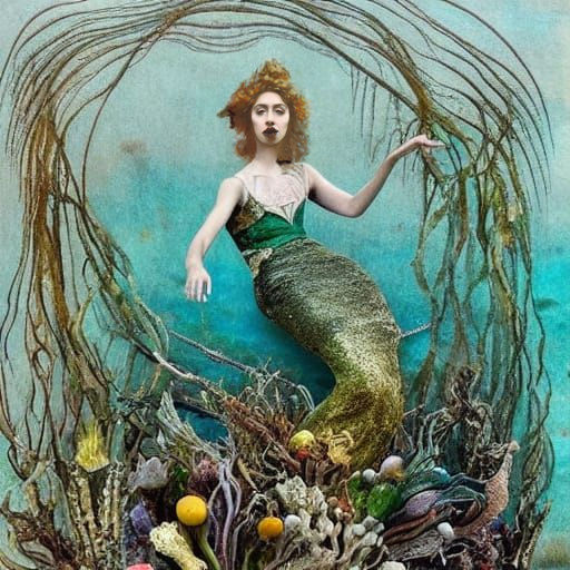 "Surrealism. Collage art. A vintage mermaid wearing a dress made of wilted vegetables, submerged in a dreamlike underwater brothel. Whimsical and eerie atmosphere. Soft, painterly watercolor style. Intricate details of seaweed and barnacles. Ethereal lighting with muted tones. Salvador Dali and Remedios Varo influence. best quality, masterpiece, intricate illustration."