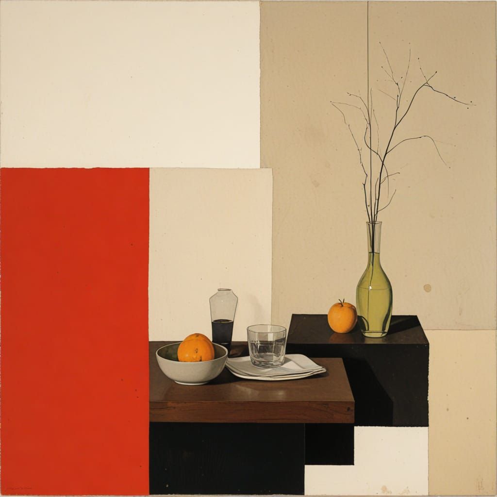 This image features an interior still life with a refined composition and muted, translucent colors, blending styles of expressionist, graphic, and academic art.