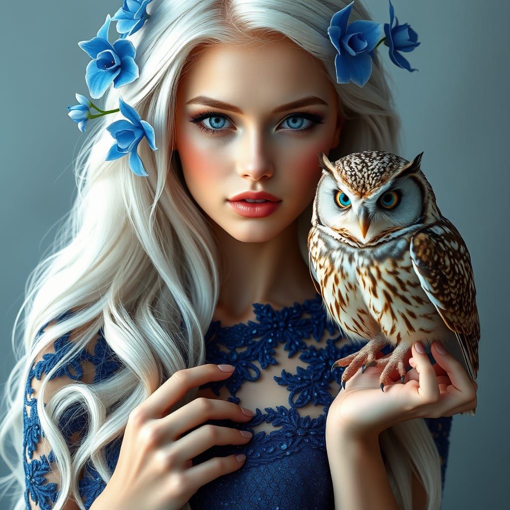 This stunning digital portrait features a radiant blonde woman with flowing platinum hair, adorned with blue orchids, wearing a beaded lace evening gown, surrounded by a sense of whimsy and elegance, blending realistic textures with a highly stylized artistic approach.