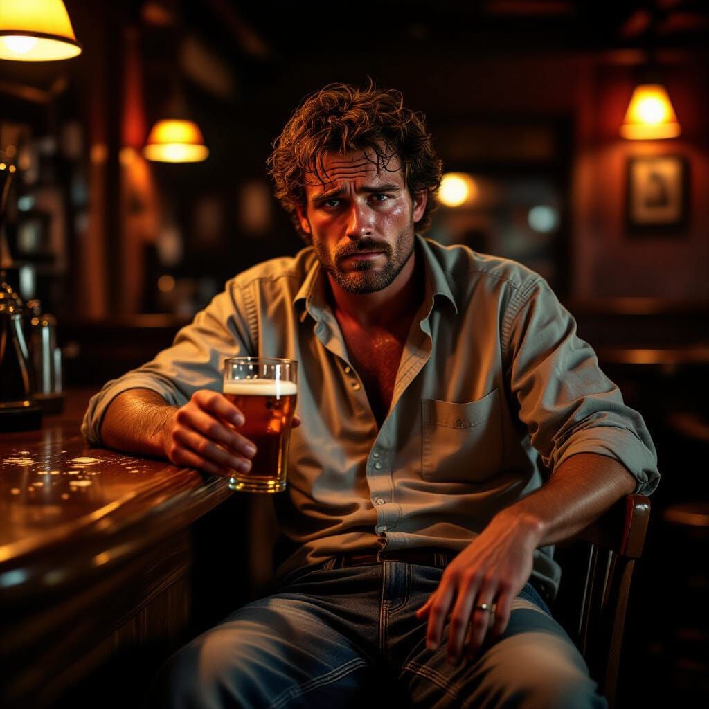 This image shows a disheveled person at a bar, with a flushed face and unsteady posture. The scene is lit with warm, dim lighting, rendered with hyper-realistic textures and attention to detail.