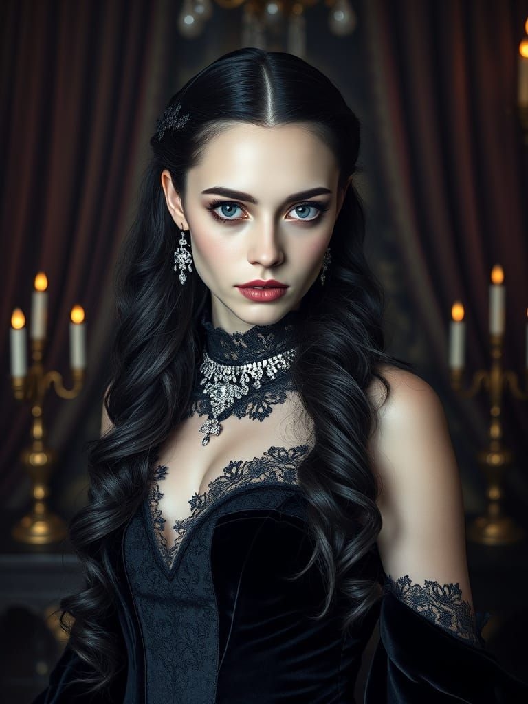 A striking picture of a celestial lady in a Victorian gothic style. The portrait features pale skin, luminous eyes, and black hair, set against a dimly lit chamber with luxurious details.