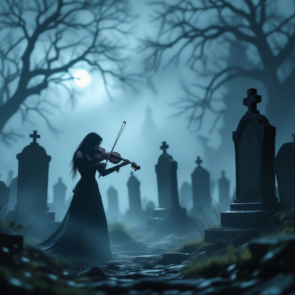 A lone musician plays a spectral violin in a desolate, fog-shrouded graveyard. Volumetric lighting creates an ethereal glow in this dark fantasy concept art.