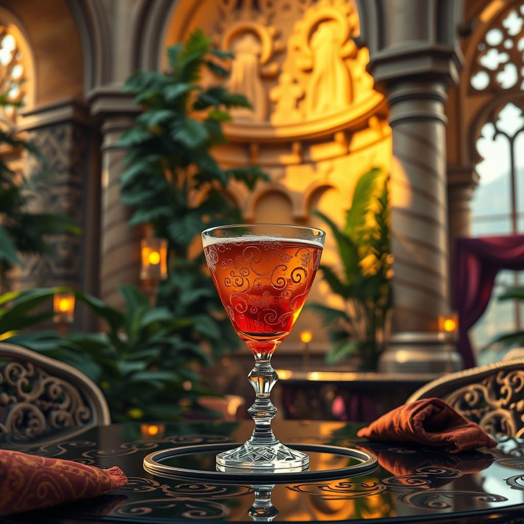 A lavish Dornish cocktail scene set amidst intricate stone carvings and lush greenery, with opulent fabrics and ornate metalwork, evoking the Seven Kingdoms' grandeur, in a fantastical, dreamlike quality