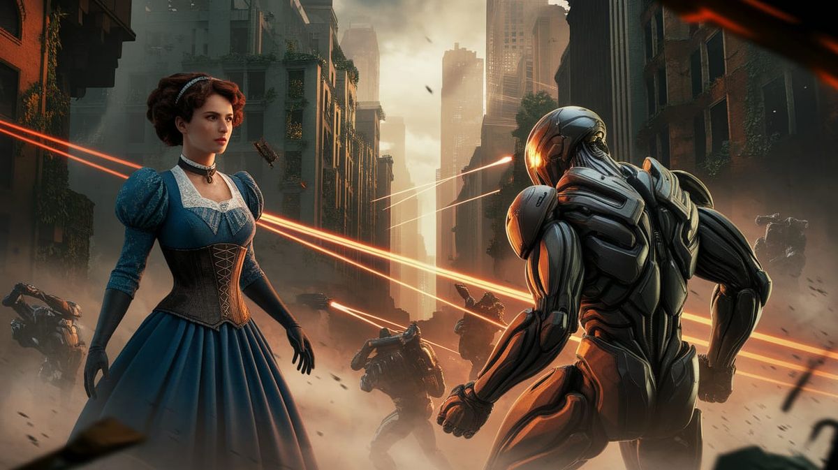 A captivating image shows Elizabeth from BioShock amidst ruins reminiscent of Crysis 3. Prophet battles Ceph enemies in this chaotic scene, illuminated by warm hues and intricate details, resembling high-definition video game graphics.