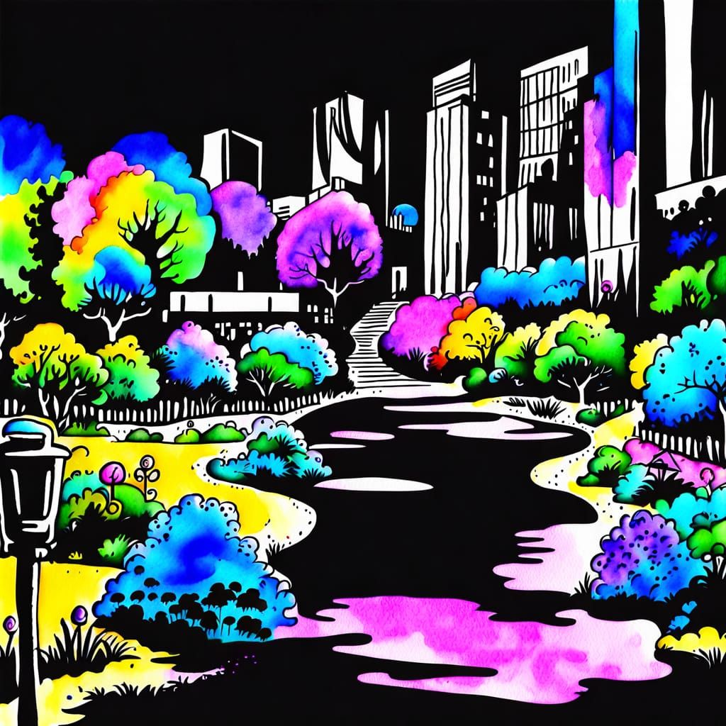 This image depicts a serene and vibrant urban garden, blending natural elements with colorful watercolor strokes, evoking a sense of utopian bliss.