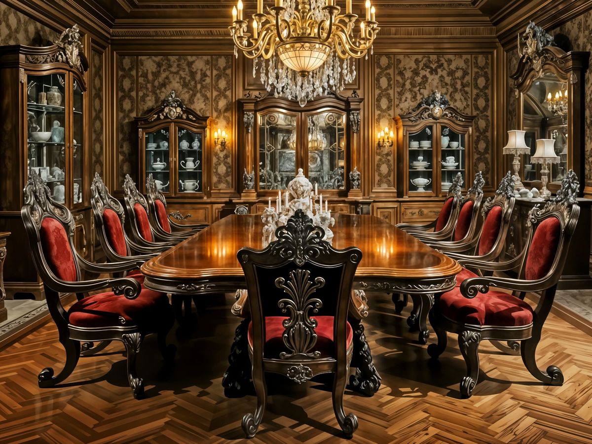 This lavish Baroque dining room features stunning walnut furniture with intricate carvings, plush upholstery, and ornate details, showcasing masterful craftsmanship and opulent grandeur.