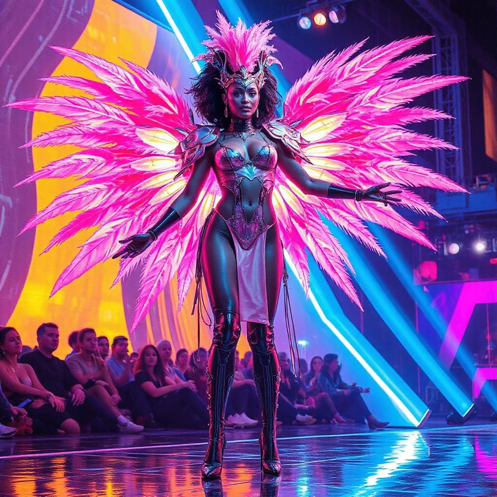 This image shows a futuristic showgirl on a neon stage. She wears a holographic feather and circuit costume, moving gracefully in a cyberpunk aesthetic with vibrant colors.