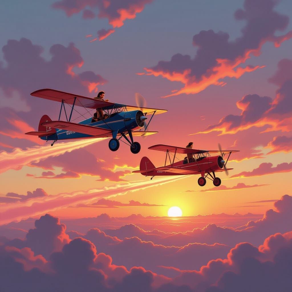 This image shows two vintage biplanes flying into a colorful sunset sky. The planes leave vibrant trails of orange, pink, and purple in a futuristic yet nostalgic aesthetic.