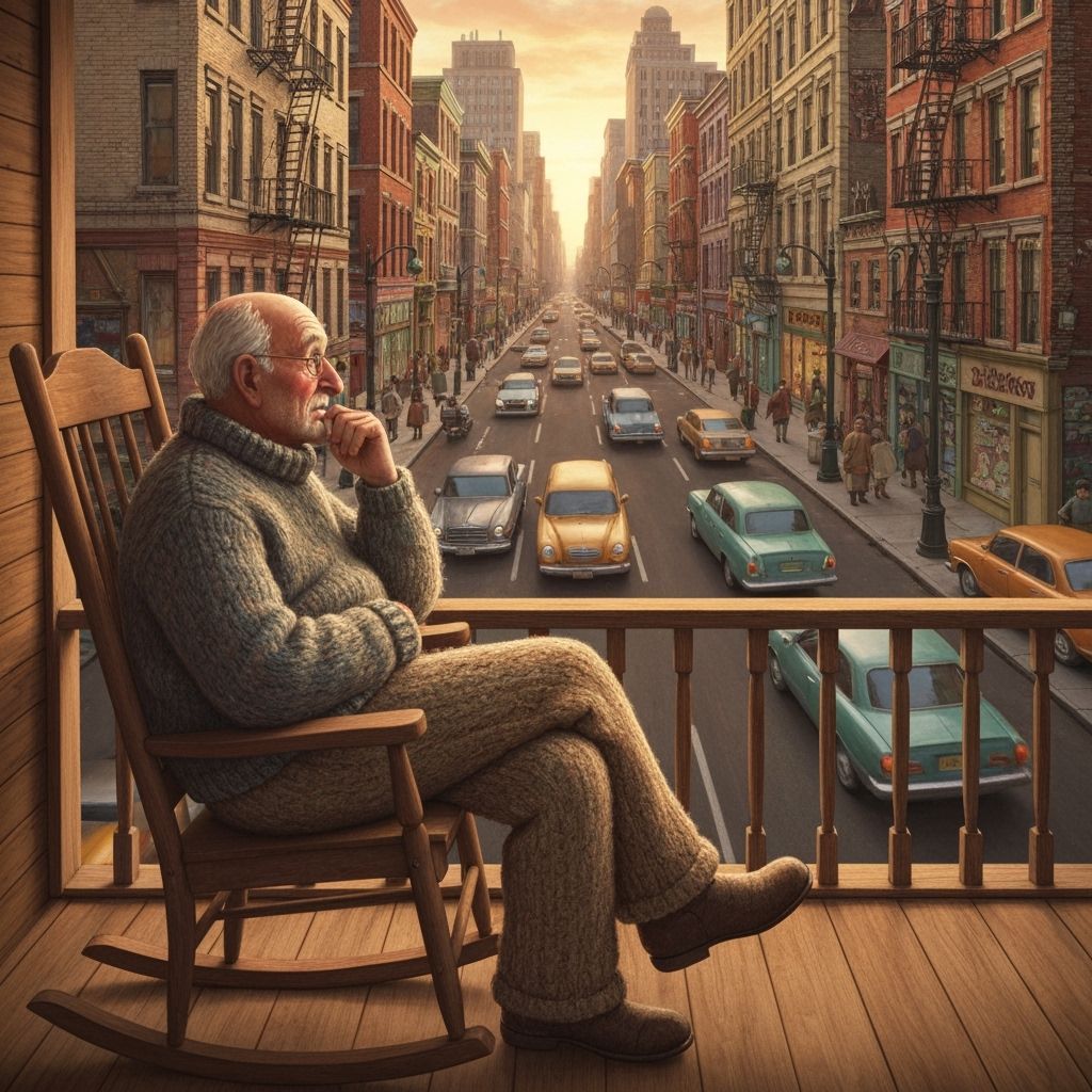 A heartwarming image showing an elderly man contemplating life. He is relaxing on a wooden rocking chair, set against the backdrop of a vibrant cityscape. The scene has a nostalgic, vintage aesthetic.