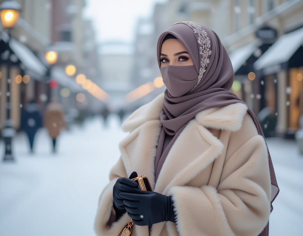This image captures a woman in a hijab and niqab, adorned in a fur coat, walking through a snow-covered city. Photographed with a shallow depth of field and natural light, it features a sharp focus and bokeh effect.