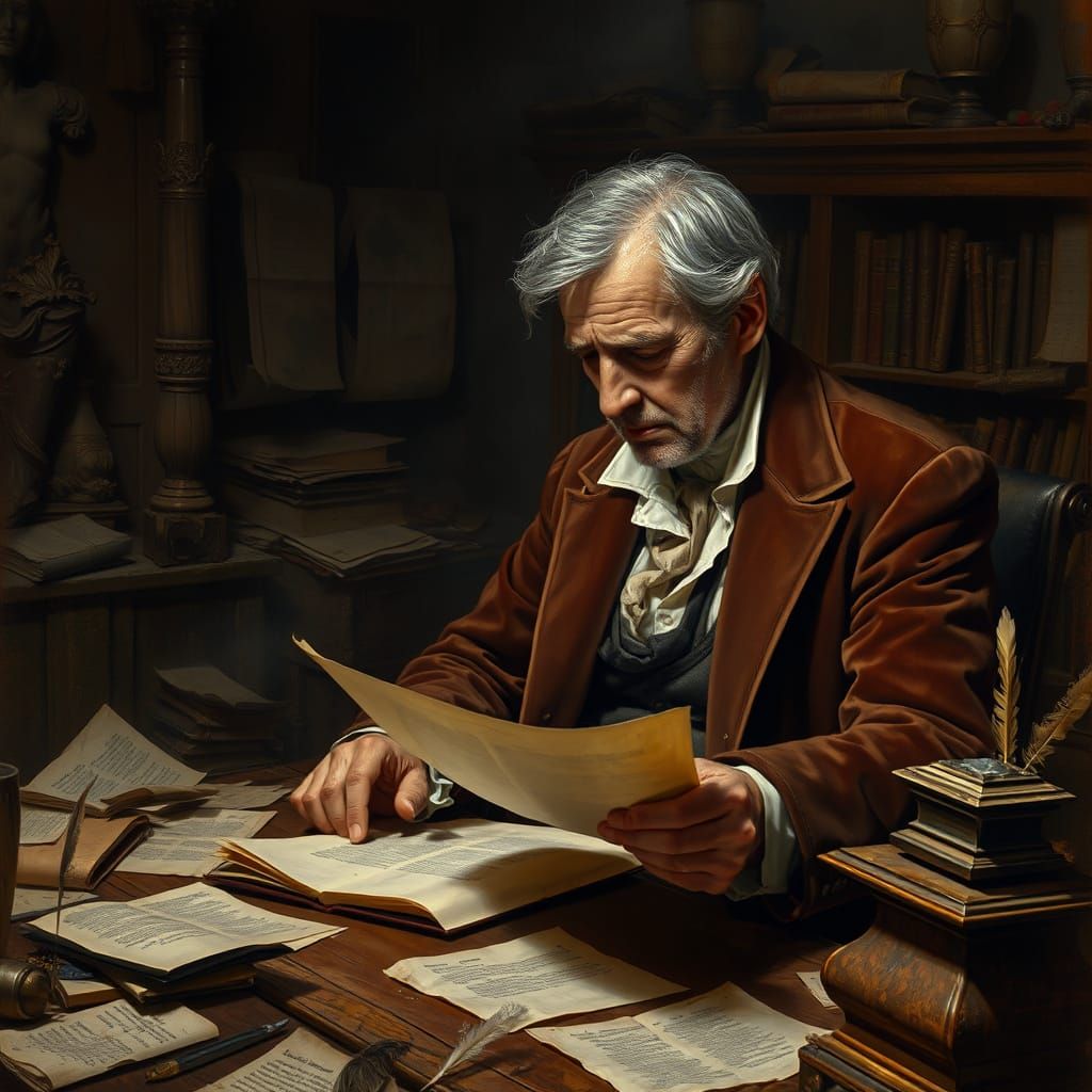 This image shows a middle-aged poet in his study, struggling with writer's block. The piece evokes romanticism and emotional intensity reminiscent of 19th-century art, with a moody, expressive atmosphere.