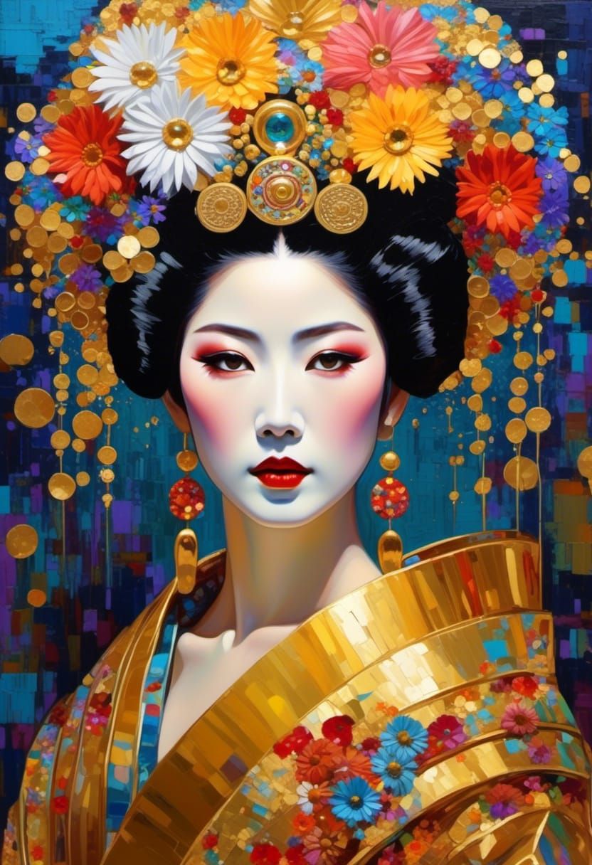 A striking portrait of a geisha wearing a daisy crown. The artwork is rendered in a vibrant, colorful neo-impressionistic style, reminiscent of impasto oil paintings with a psychedelic and bohemian flair.