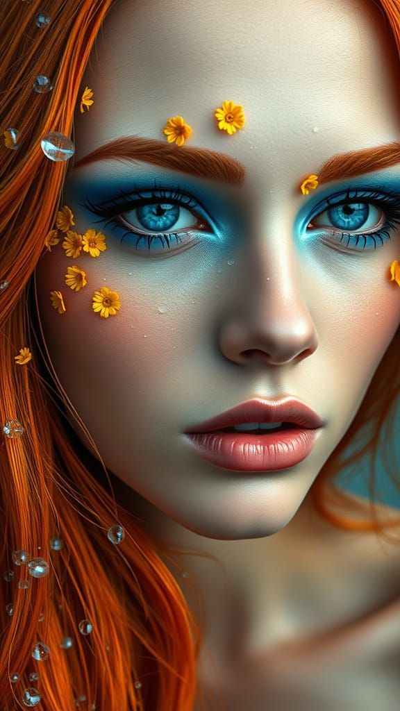 This image showcases a stunning, close-up portrait of a woman with intensely detailed, floral-inspired makeup and long, flowing hair, set against a vibrant, aquatic backdrop with a smooth, ethereal style reminiscent of impressionistic art.