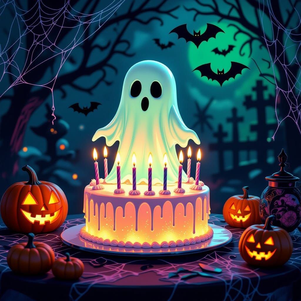 A whimsical illustration of a ghost's birthday party. Features a glowing cake, pumpkins, and bats in a playful, gothic style with vibrant contrasting colors.