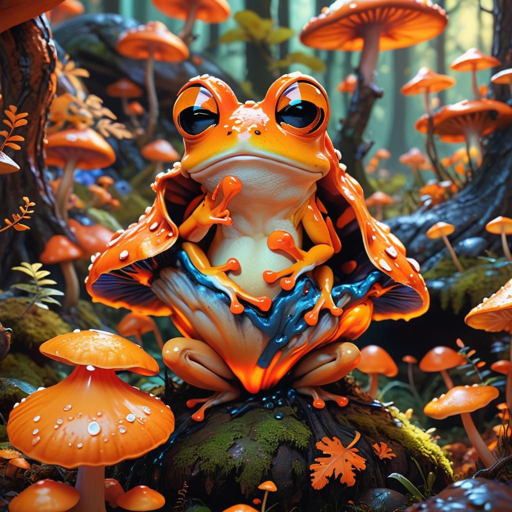 A striking picture of an orange frog sitting on an orange mushroom in an orange forest. This fantasy art utilizes triadic colors, warm golden hour lighting, and deep shadows to create a cinematic, hyper-realistic scene.
