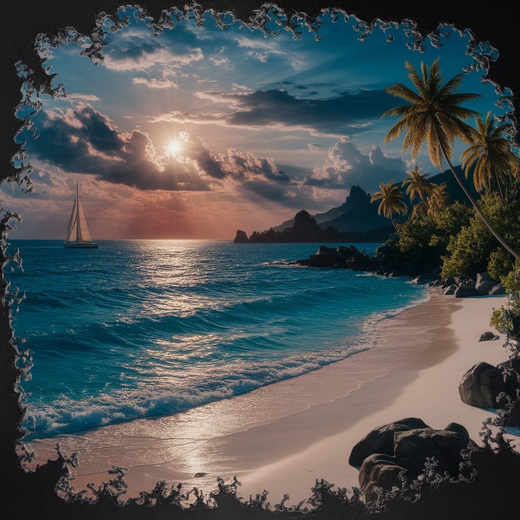 This image shows a hyperrealistic tropical paradise scene at sunset. A sailboat glides on the ocean near a sandy beach, with palm trees framing the view. The painting features dramatic contrast and moody tones.