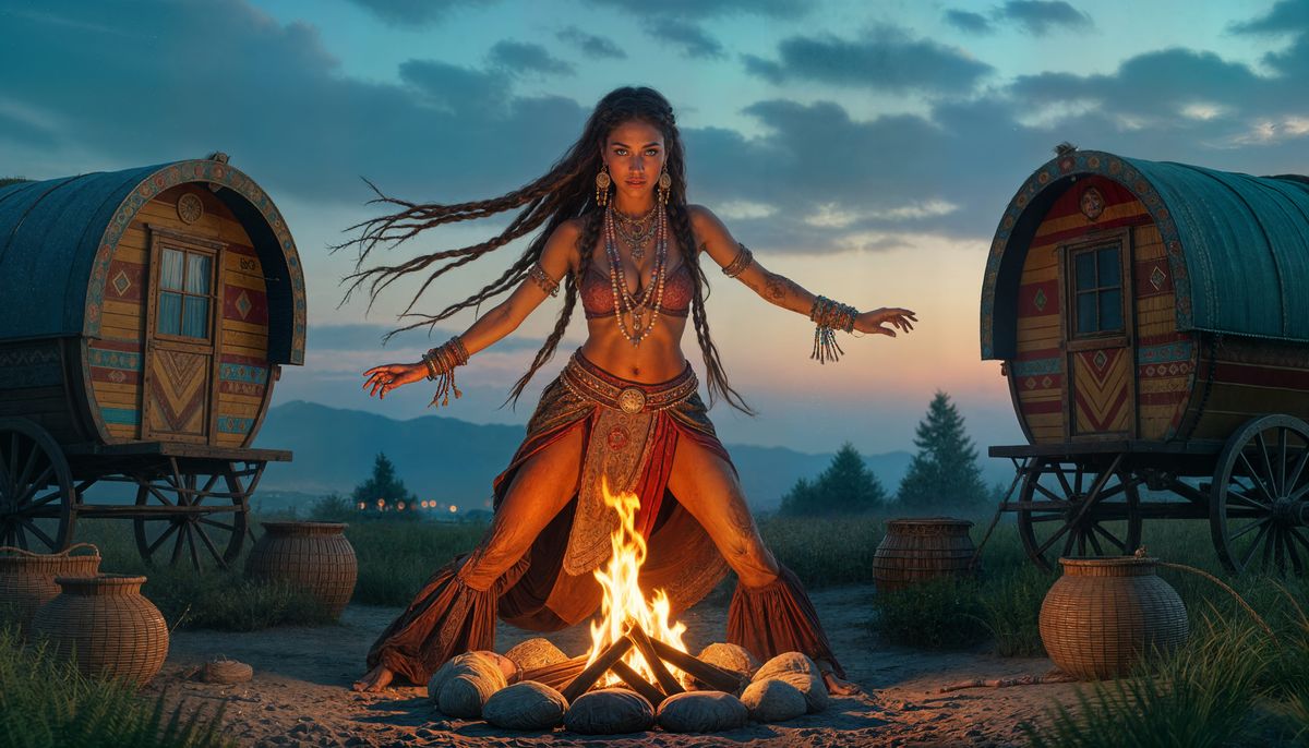 A vibrant image shows a bohemian gypsy dancing around a fire. She has long, wavy hair with braids, expressive eyes, and is wearing traditional clothing in cinematic lighting.