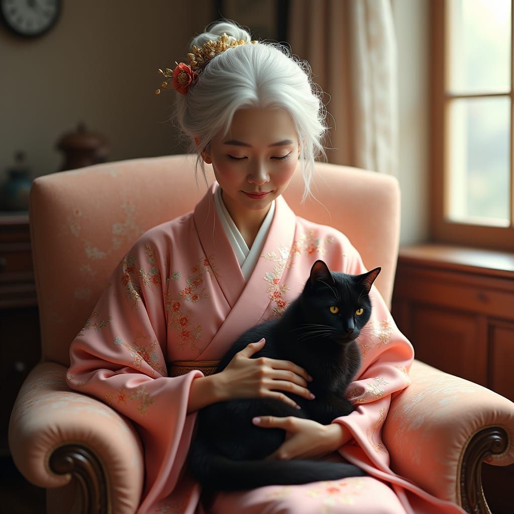 A stunning portrait of a Japanese lady in a beautiful pink kimono, surrounded by delicate cherry blossoms and a majestic black cat, set against a soft, diffused light. Inspired by fantasy concept art, this hyperrealistic image features intricate textures and deep, rich colours, reminiscent of a 8k resolu...