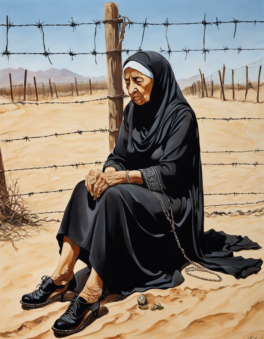 This alcohol ink and oil-guache drawing depicts an elderly Middle Eastern woman in a hijab, looking desperate and exhausted. She sits in the sand near a barbed wire fence under sunlight.