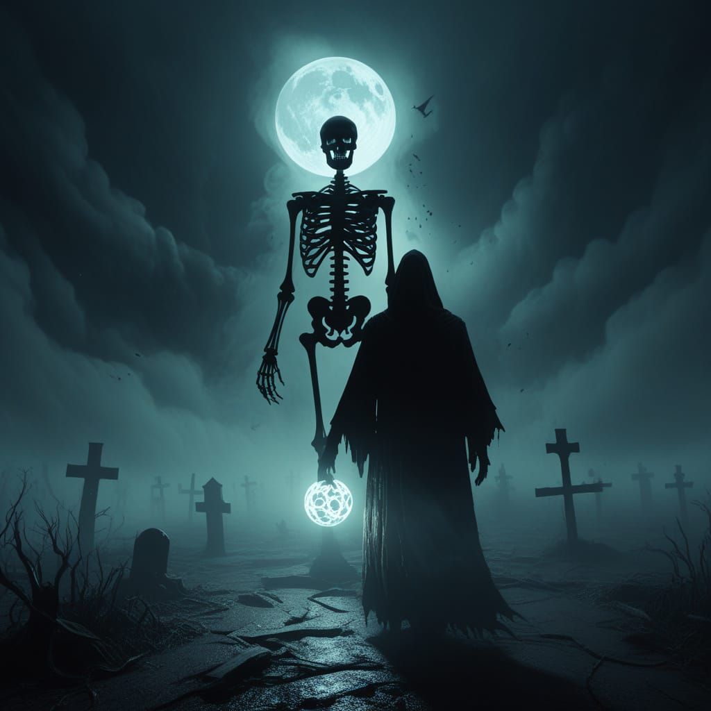 This dark fantasy art depicts a skeletal figure in tattered robes emerging from a vortex, holding a glowing orb over a surreal, misty landscape with volumetric lighting.