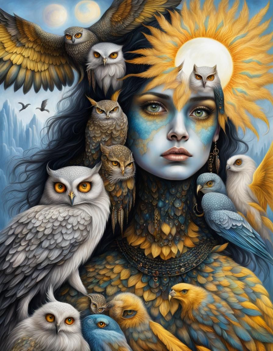 A surreal portrait of a fantasy girl with face paint and a feathered tiara, encircled by birds of prey. This concept art piece features chaotic, pastel colors and intricate details.
