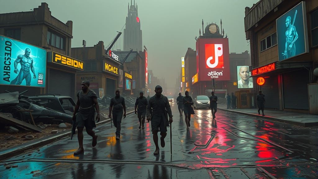 This image depicts a post-apocalyptic African village in a state of decay, with villagers clad in makeshift armor and tattered clothing navigating through the rubble, under the glow of neon-lit holographic advertisements and the faint gleam of cybernetic enhancements.