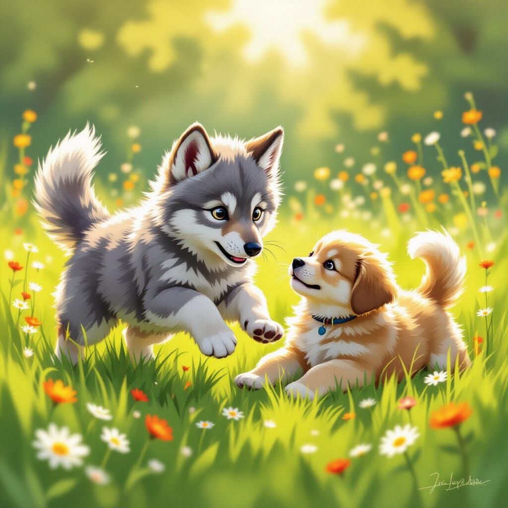 This image shows a fluffy wolf pup and a golden retriever puppy playing together in a sunlit meadow. Rendered in a whimsical storybook illustration style with vivid colors and soft light.