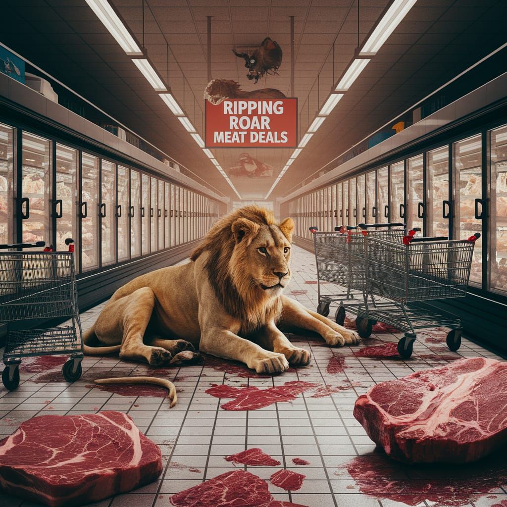 A surreal photograph shows lions prowling through a decaying Tesco supermarket. Nature has reclaimed the abandoned store, with scattered meat and ravaged freezers under flickering lights.