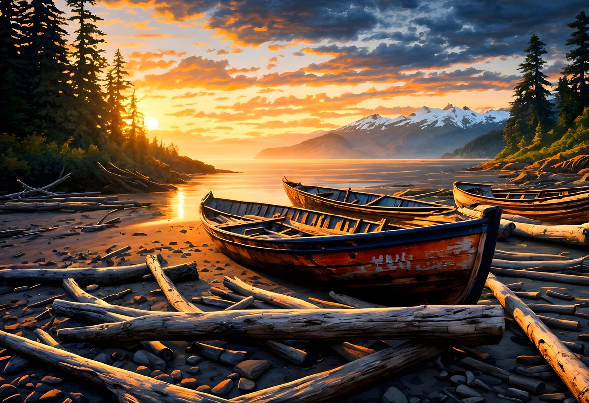 This image depicts a serene Pacific Northwest beach scene with a Salish Sea inlet, old wooden row boats, and a backdrop of rocky tree-covered islands, all set against a warm and vibrant sunset. The intricate details and maximalist approach evoke the feeling of a meticulously crafted oil on canvas paintin...