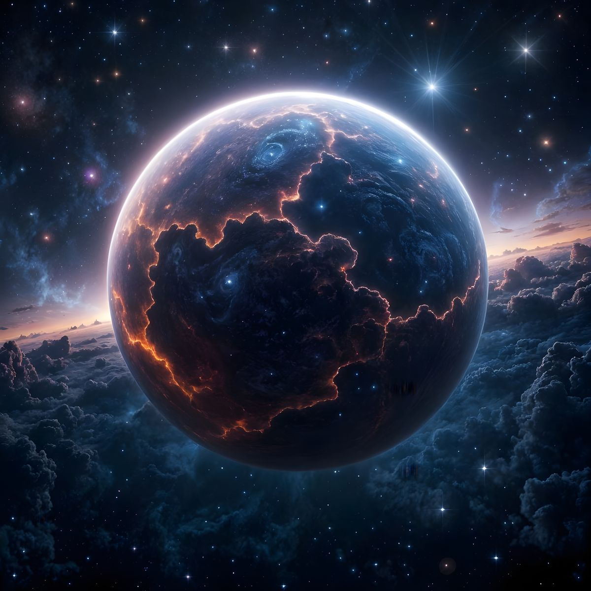 A majestic gaseous planet shines against a starry galaxy backdrop, with intricate clouds of iridescent gas and dust, illuminated by distant stars.