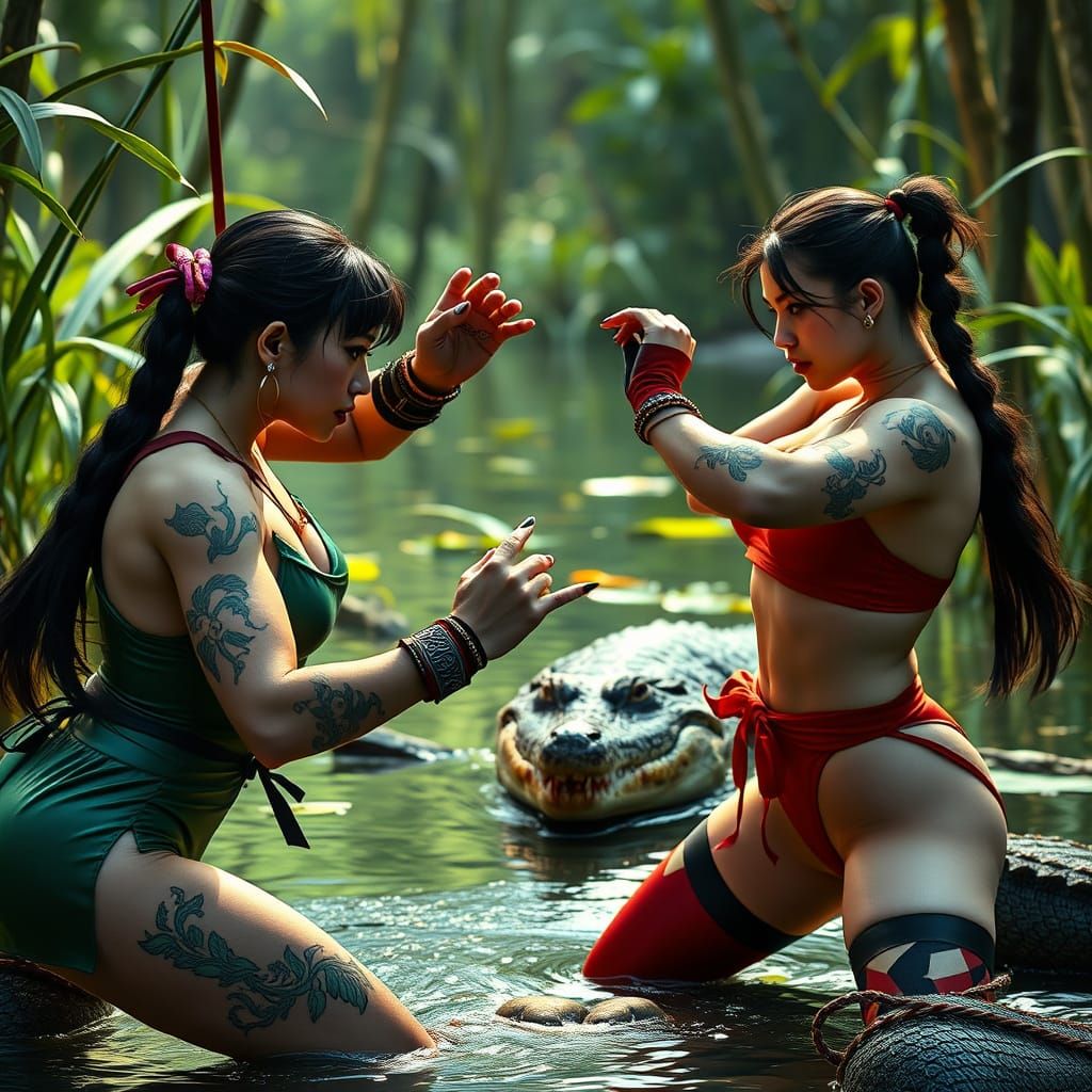 This image shows a photorealistic scene of Chun-Li, Cammy, and Juri from Street Fighter, armed with supernatural powers, battling in a sandy arena surrounded by a misty swamp, giant crocodiles, and spiders, dressed in elaborate, minimalist outfits with intricate tattoos and luxurious jewelry, in a cinema...