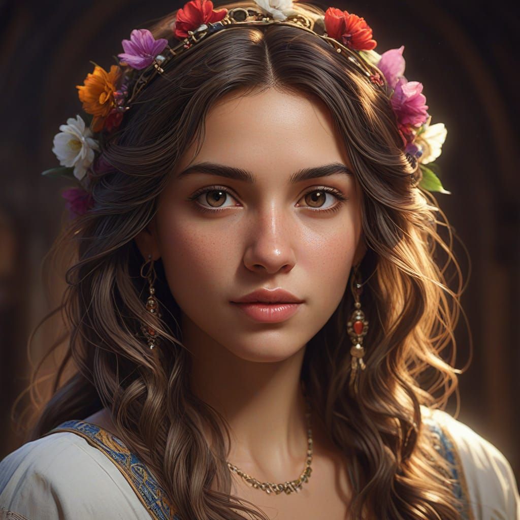 A detailed portrait of a beautiful Spanish woman seeking her ancestry. The image is rendered with dynamic lighting and intricate detail, in a style reminiscent of art nouveau.