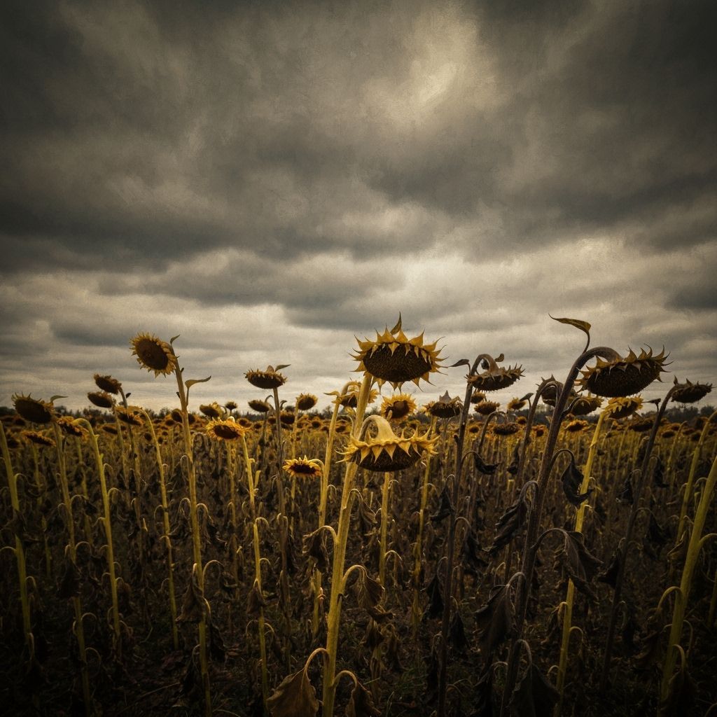 This image shows a field of wilting sunflowers against a moody, overcast sky. Rendered in an atmospheric oil painting style with visible brushstrokes and muted colors, it evokes a sense of quiet sorrow.
