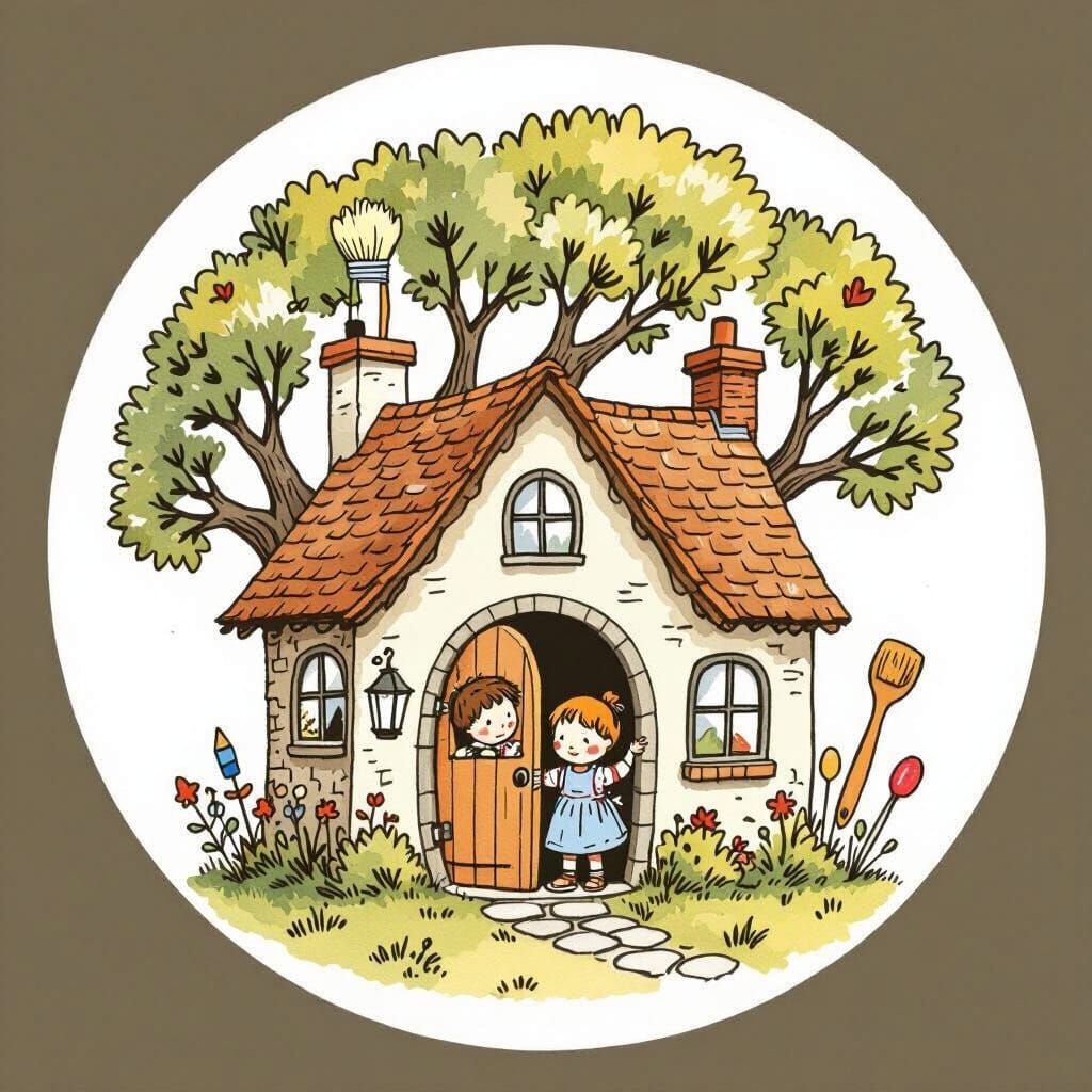 A whimsical logo for an English language school featuring a cottage house. A boy and his mother are visible, with a large tree bearing artistic implements. The artwork suggests a children's book illustration.