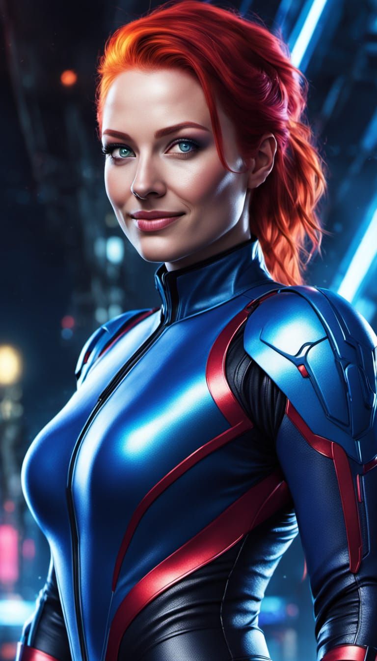 This image shows a young woman with bright red hair and blue eyes smiling confidently. The portrait features glowing energy lines and metallic details in a futuristic, vibrant, sci-fi aesthetic.