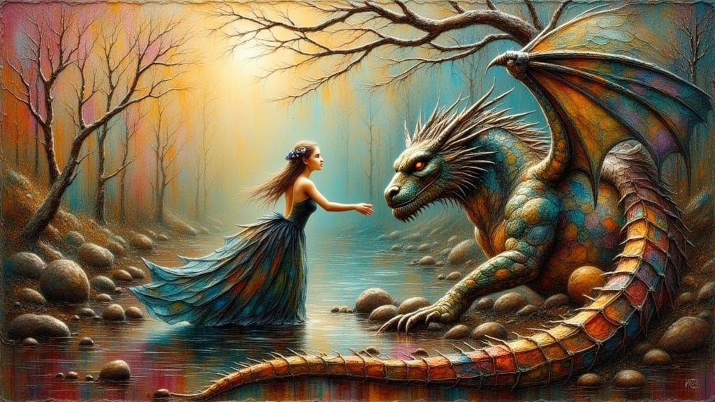 A layered impasto painting of a princess and a dragon in friendship. The image employs oil glazing and thick texture to bring depth to the unlikely bond.