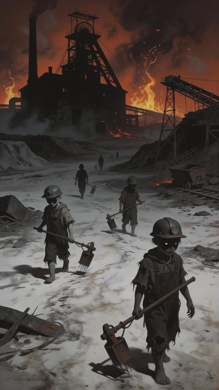 This surreal artwork depicts a dark, gothic factory and mine set against a hellish, demonic background. Small, child-like creatures with mining and factory gear wander the scene in a striking red and black color scheme.