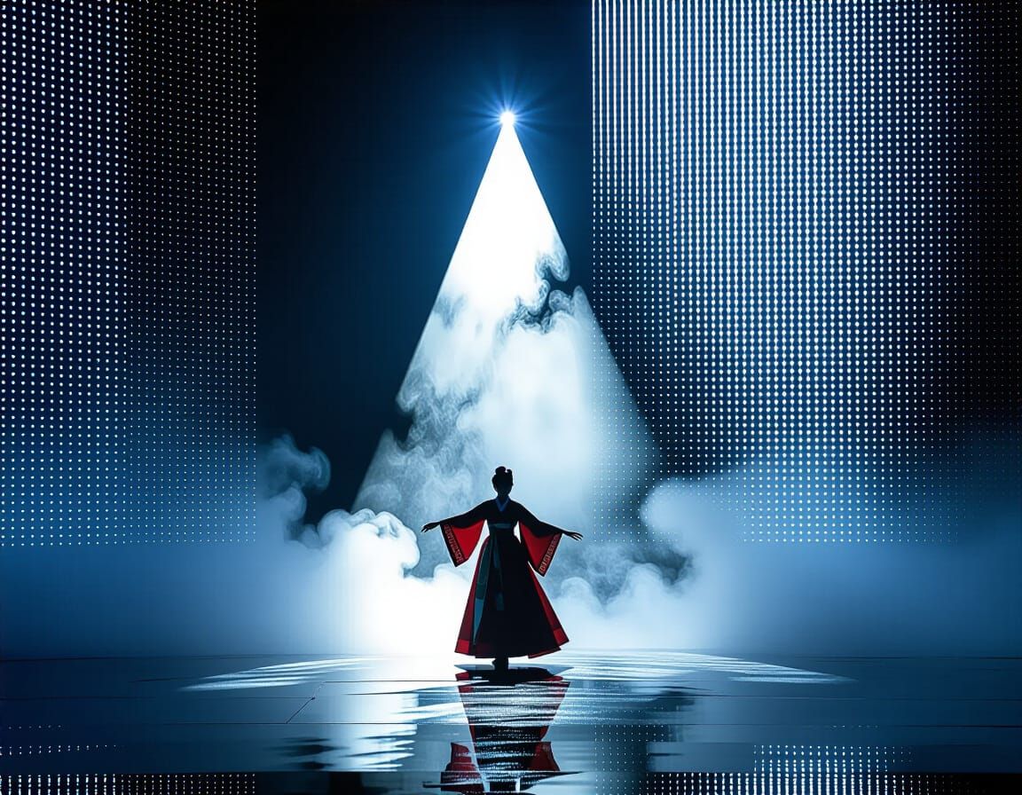 This striking image features a Korean woman in traditional dress dancing in a dramatic spotlight. The high-contrast composition uses deep shadows and bright light to create a mysterious and contemplative atmosphere.