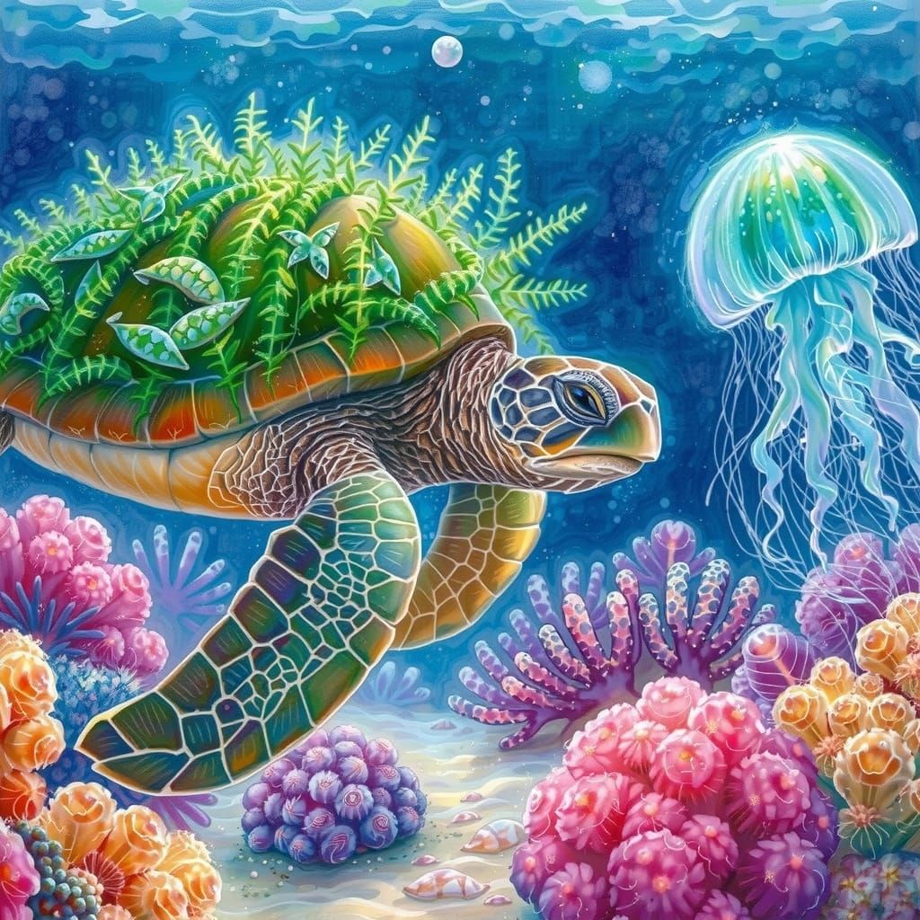 This image shows a sea turtle with a seaweed-covered shell swimming near colorful coral reefs, accompanied by a translucent jellyfish. It features vivid, luminous colors and golden hour lighting, rendered in a delicate brushstroke style.