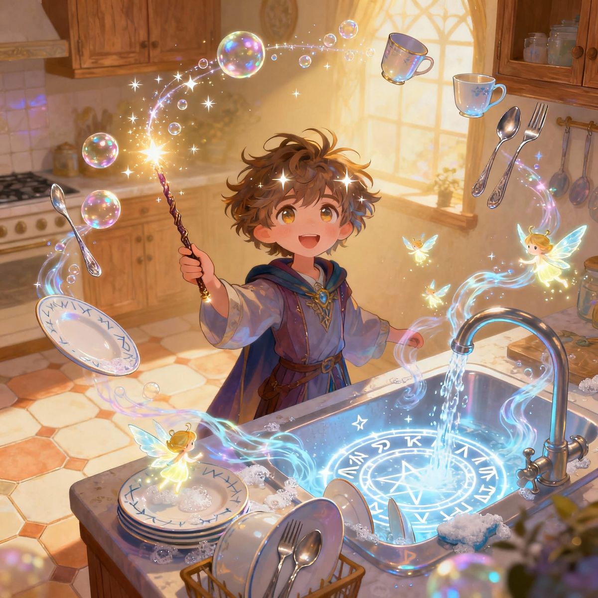 A charming image of a young mage performing a magical chore, with floating dishes, enchanted water, and glowing sprites in a cozy, whimsical kitchen setting. The scene is filled with lighthearted wonder.