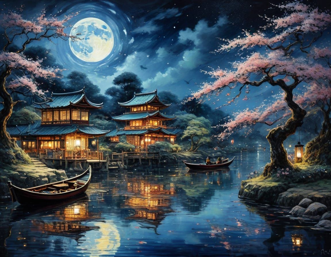 A striking picture of a beautiful woman in a colorful kimono kneeling in a boat. She is lifting a glowing lantern into the night sky, which is full of floating lanterns in this fantasy oil on canvas.