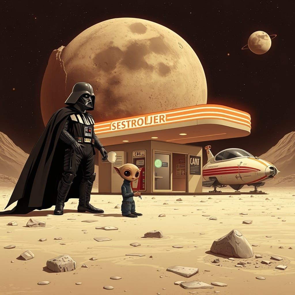 This image captures a nostalgic and futuristic scene of a space alien refueling at a vintage gas station on the moon, with a sleek astroship parked nearby, set against a deep space sky with a warm sepia tone, evoking the style of classic sci-fi artists