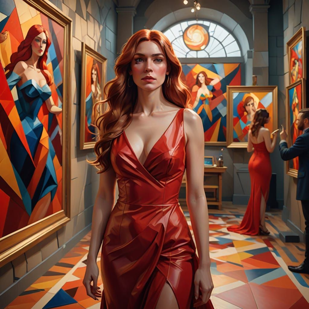 This image shows a striking woman with auburn hair in a red dress painting a self-portrait in an art gallery. The work is rendered in a cubist style with dynamic lighting and vivid colors.