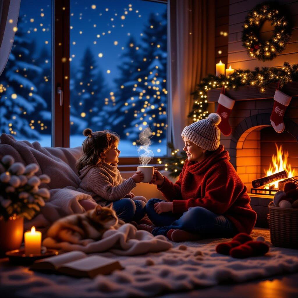 This ultra-realistic image captures a warm, glowing Christmas interior with a child offering cocoa to a grandparent. Features subtle festive symbols and a serene snowfall outside, creating a mood of renewal.